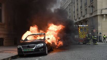 Foto: Un coche ardiendo en la protesta de los chalecos amarillos, cerca del Arco del Triunfo en París. (AFP)