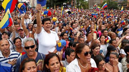 No es baladí que el primer gobernante en reconocer a Guaidó fuese Donald Trump. Horas antes, su vicepresidente, Mike Pence, había respaldado las manifestaciones convocadas hoy en Venezuela por la oposición, dirigiéndose a los críticos con Maduro en español, algo poco habitual en esta Administración estadounidense. En un comunicado, Trump ha animado a otros Gobiernos occidentales a reconocer al presidente de la Asamblea Nacional como presidente interino del país, y ha asegurado que utilizará “todo el peso del poder económico y diplomático de Estados Unidos para presionar por la restauración de la democracia venezolana”.