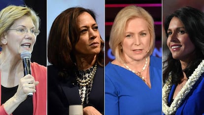 La campaña electoral para las elecciones presidenciales de otoño de 2020 acaba de comenzar en Estados Unidos. Habrá quien fije su fecha de arranque más adelante, en el proceso de primarias que dentro de un año escogerá al candidato final de cada partido a la Casa Blanca, y también quien retroceda hasta el 9 de noviembre de 2016, al día siguiente de la victoria de Donald Trump contra Hillary Clinton, como inicio de la batalla. Pero el punto de inflexión más evidente fueron las legislativas del pasado noviembre. Tras ellas, y con el buen resultado para los demócratas caldeando el ambiente, una ristra de aspirantes del partido anunció su intención de convertirse en el próximo presidente de Estados Unidos. O presidenta. Porque de entre los nueve nombres ya en la lista, cuatro son mujeres, y tres de ellas figuran entre los más relevantes en el ámbito nacional.