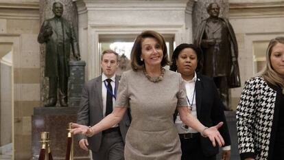 “Mi estilo de negociar es bastante simple y directo. Apunto muy alto y entonces empujo y empujo hasta conseguir lo que busco”. Así es como Donald Trump definía en los años ochenta su estrategia negociadora en el salvaje mercado inmobiliario de Manhattan. Y ese es el estilo que ha marcado también su presidencia. Su pulso por arrancar una partida presupuestaria para empezar a construir el polémico muro en la frontera de México —arguyendo la lucha contra la inmigración irregular— llevó al cierre de la Administración federal el pasado diciembre por falta de fondos. Si los legisladores demócratas no pasaban por el aro de ese muro, no habría acuerdo de financiación y, por tanto, cerraría el Gobierno. Amenazó con mantenerlo así hasta el infinito. Pero el viernes, tras 35 días, claudicó y reabrió la Administración sin rastro de esos dólares. Se había estampado con otro muro bien distinto, que no esperaba: Nancy Pelosi.