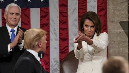 Trump parece el mismo que hace un año —el mismo que hace dos, incluso, en su primer discurso— y muchas de las ideas esgrimidas este martes habían retumbado ya en el Capitolio y en la Casa Blanca con anterioridad. Lo que le rodea, sin embargo, ha cambiado. Nada como la imagen de la demócrata Nancy Pelosi, mazo en mano, al frente de la sesión, como presidenta de la Cámara que es, para reflejar el cambio de tornas en esa parte del Congreso. Los republicanos mantienen el control del Senado, pero desde las elecciones legislativas de noviembre, los progresistas han recuperado la mayoría en la Cámara baja y eso maniata buena parte de la agenda política trumpista.