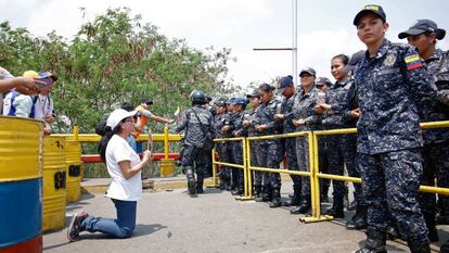 "Los acontecimientos de hoy me obligan a tomar una decisión: plantear a la comunidad internacional de manera formal que debemos tener abiertas todas las opciones para lograr la liberación de esta patria que lucha y seguirá luchando. ¡La esperanza nació para no morir, Venezuela!", escribió en un tuit, poco después de comparecer en rueda de prensa junto al presidente colombiano, Iván Duque, y el secretario general de la Organización de los Estados Americanos, Luis Almagro. Sus palabras remiten al fantasma que precisamente agita el Gobierno de Nicolás Maduro, el de la intervención militar, que su archienemigo, el Ejecutivo de Trump, no ha dejado de insinuar. El domingo aprovechó esa circunstancia el vicepresidente para la Comunicación, Jorge Rodríguez, que llamó "peligroso" a Guaidó y, entre descalificaciones de carácter personal, dijo que "no había intención de traer ningún tipo de ayuda humanitaria". También se dirigió a los seguidores del presidente interino para afirmar que "las bombas no solo matan a chavistas".
