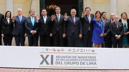 El Grupo de Lima ha reiterado este lunes que la “transición a la democracia” en Venezuela “debe ser conducida por los propios venezolanos pacíficamente”, apoyada por medios políticos y diplomáticos sin uso de la fuerza. El bloque le baja así el volumen a la posibilidad de una intervención militar, un fantasma frecuentemente agitado desde el chavismo, en la misma jornada en que la Unión Europea pidió a Estados Unidos prescindir de esa opción. Los Gobiernos de Argentina, Brasil, Canadá, Chile, Colombia, Guatemala, Honduras, Panamá, Paraguay, Perú y, por primera vez, Venezuela, representada por Juan Guaidó, reconocido por más de 50 países como mandatario interino, firmaron una declaración en la que también “exigen la salida inmediata de Nicolás Maduro y el cese de la usurpación, respetando la autoridad constitucional de la Asamblea Nacional y al presidente encargado”.