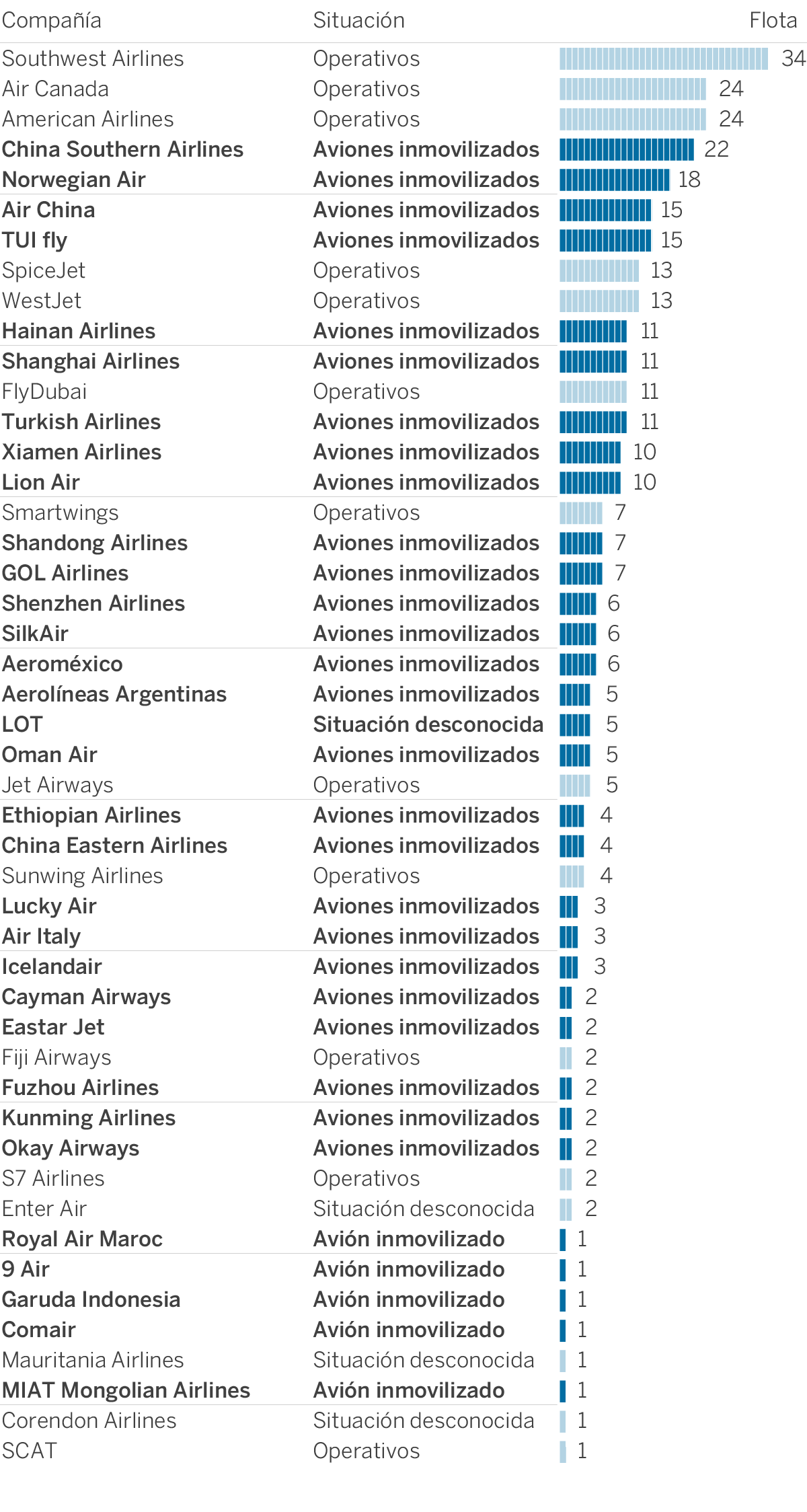 Las dudas sobre la fiabilidad del avión, aunque no haya una investigación concluida, fueron suficientes para que se iniciara el efecto contagio que provoca el pánico. La Agencia Europea de Seguridad Aérea (EASA, por sus siglas en inglés) y la India se unieron al veto por tiempo indefinido de cualquier operación de un 737 MAX 8 en su espacio aéreo. Por entonces, 32 aerolíneas que tienen en su cartera 200 de esos aviones habían anunciado que los dejarían varados en los aeropuertos. Había quedado ya fuera de circulación el 60% de la flota operativa a escala global de la versión más moderna del 737. Este miércoles, Emiratos Árabes Unidos, Vietnam, Nueva Zelanda, Líbano, Hong Kong y Guinea Ecuatorial, entre otros, también se han sumado a la extensa lista de países que han cerrado su cielo al Boeing 737 MAX 8.