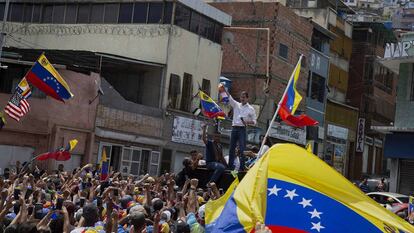 Todo comenzó a las 9.00 de la mañana del domingo con una arepa en un mercado popular. Juan Guaidó se sentó acompañado de cuatro colaboradores, pidió una de queso, otra de pescado y un refresco. Tres horas después, estaba subido en lo alto de un camión con un micrófono y una bandera ante miles de personas que coreaban su nombre.