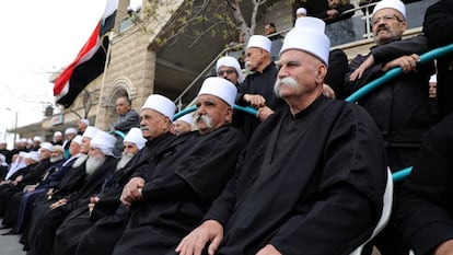 “Somos sirios, leales a la República Árabe Siria y a nuestro presidente, Bachar el Asad”. Vestido de solemne negro y tocado con un fez blanco, el líder espiritual Jad al Karim Nasser es la quintaesencia del pueblo druso, la minoría religiosa asentada en los Altos del Golán desde tiempo inmemorial. En la misma valla fronteriza de la meseta ocupada por Israel a partir de 1967, y a solo un kilómetro del mirador de la Colina de los Gritos —donde los drusos de Siria se comunicaban en el pasado con sus parientes de Majdal Shams, el pueblo situado más al norte del Golán—, desafía con su poblado mostacho al presidente de Estados Unidos. “La decisión de [Donald] Trump no cambia la situación”, advierte el jefe religioso y líder comunal de la localidad de Buqata, “al contrario, refuerza nuestra voluntad de defender esta tierra”.