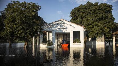 En Caacupemi, la escuela de la zona, administrada por la red jesuita Fe y Alegría, estudian más de dos centenares de niñas y niños, y está inundada hasta casi el segundo piso. En la puerta, donde antes se acumulaban bicicletas, ahora hay barcas de madera flotando. El agua casi tapa el cartel de la Unión Europea que recuerda el apoyo brindado por el bloque comunitario a esta zona en una inundación pasada: “#devueltaacasa. Proyecto de ayuda humanitaria a familias afectadas por el fenómeno El Niño en Asunción”.