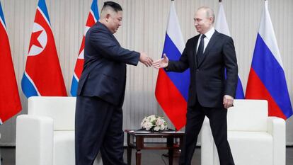 Para Kim está también sobre la mesa un asunto sustancial: los alrededor de 10.000 trabajadores norcoreanos que trabajan en Rusia y que deberían salir del país a final de año debido a las sanciones. Esta mano de obra en el exterior es una de las principales fuentes de ingresos para Corea del Norte, que recibe unos 500 millones de euros al año en divisas —el 1,5% de su economía—. Así que Moscú y Pyongyang buscan ahora el formato para que puedan quedarse. Putin se mostró convencido de que encontrarían una solución.