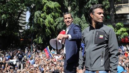 “¡Todos a la calle, todos a la calle!”, gritaba Leopoldo López la mañana de este martes en las avenidas de Caracas después de ser liberado del arresto domiciliario en el que cumplía una condena de 13 años de prisión. El polémico líder de la oposición apareció al lado de Juan Guaidó, el presidente interino reconocido por la Asamblea Nacional, en las cercanías de la base aérea La Carlota. El político estuvo durante varias horas como huésped en la Embajada chilena en Caracas junto a su esposa, Lilian Tintori, hasta que esta noche se han trasladado a la sede diplomática española, según ha asegurado el ministro de Exteriores de Chile, Roberto Ampuero.
