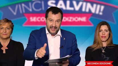 El vídeo de presentación de Vinci Salvini (“Gana a Salvini”, en español, aunque en realidad quien gane sea él) es un arrebato publicitario kitsch de un minuto y 49 segundos que desafía todas las reglas del ridículo político. Y esa es la gracia. El líder de la Liga aparece rodeado de antiguos vencedores del concurso con un croma azul de fondo sobre el que desfilan emoticonos, corazones y símbolos de redes sociales. Él pone voz de presentador de concurso televisivo y lo explica. “Cuantos más likes pongas en mi página, cuanto más rápido seas… más puntos acumulas. Los más afortunados ganaréis una charla conmigo al teléfono. Ayúdanos a difundir nuestra idea de Italia, de Europa y de futuro”, señala asumiendo de antemano las críticas que recibirá por ello.