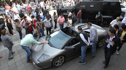 Mediodía de domingo, residencia de Los Pinos, vieja casa de los presidentes mexicanos. Una jauría de compradores ocasionales prepara sus paletas bajo una enorme carpa blanca. La subasta de carros va a empezar. La maestra de ceremonias explica las normas, el martillero bromea. Unas 400 personas, según la secretaría de Hacienda, se han registrado para participar. El doble o el triple disfruta -sufre- el sol del altiplano, tomándose fotos con las joyas del lote, que incluye decenas de vehículos de lujo. Ante todos, por encima de todos, figura un Lamborghini murciélago de 2007, encajado entre dos vehículos blindados de la policía.