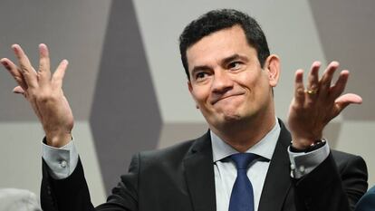Aunque formalmente solo lleva seis meses en política, el exjuez Sergio Moro ha elegido defenderse en ese terreno, el de política, sin entrar en los farragosos entresijos de la ley, de las polémicas revelaciones que arrojan dudas sobre su imparcialidad en el caso Lava Jato. Moro, 46 años, que este miércoles ha comparecido a petición propia ante el Senado, en Brasilia, no ha reconocido la autenticidad los mensajes que intercambió con los fiscales del proceso –“no sé si han sido manipulados porque no conservo los originales”—que publica por goteo el medio digital The Intercept Brasil. El ministro más popular del Gobierno de Jair Bolsonaro ha presentado a los investigadores como víctimas de un pirateo organizado por un grupo criminal para, ha recalcado, revertir “las conquistas (contra la corrupción) de la sociedad brasileña”.