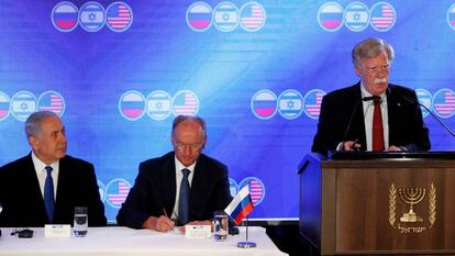 En una inusual cita a tres bandas en Jerusalén, el consejero de seguridad nacional de Estados Unidos, John Bolton, ha dejado este martes abierta la puerta al diálogo con Irán, un día después de que la Casa Blanca impusiera nuevas sanciones a la cúpula política y militar de Teherán. Bolton, uno de los halcones más radicales de la Administración del presidente Donald Trump, se reunió en la ciudad santa con el secretario del Consejo de Seguridad de Rusia, Nikolai Patrushev, ante el primer ministro israelí, Benjamín Netanyahu, para analizar la crisis desatada con Irán y la situación en Siria.
