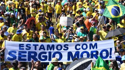 Los movimientos derechistas que sacaron a medio Brasil a la calle para impulsar la destitución de Dilma Rousseff, en 2016, han movilizado este domingo a miles de personas en decenas de ciudades. Los actos fueron convocados en defensa del ministro Sergio Moro, antiguo juez y símbolo de la lucha contra la corrupción, bajo presión ahora por la revelación de sus diálogos privados con los fiscales. Pero los manifestantes aprovecharon para mostrar su descontento; su indignación no es ahora contra el Gobierno, que lidera su aliado Jair Bolsonaro, sino contra el Tribunal Supremo y el Congreso, a los que muchos acusan de entorpecer las iniciativas legislativas gubernamentales. Es la segunda vez en un mes que bolsonaristas marchan contra otros poderes del Estado.