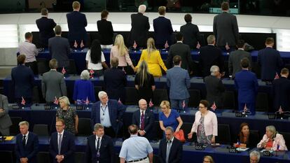 Los eurodiputados británicos del Partido del Brexit parecen dispuestos a no desperdiciar ninguna oportunidad para mostrar su desafección hacia la Unión Europea. Menos aún si el golpe de efecto pueden hacerlo en su seno y rodeados de cámaras. Sus miembros demostraron este martes que, lejos de haber cambiado, cinco años después sus obsesiones, como su líder, Nigel Farage, son idénticas a las del UKIP, el partido al que han engullido y reemplazado en el mapa político. Durante la sesión inaugural del Parlamento Europeo, los 29 eurodiputados de la formación más votada de Reino Unido en los últimos comicios, han repetido su gesto de 2014, y se han colocado de espaldas en la Eurocámara cuando los músicos interpretaban el himno europeo, la Oda a la alegría de Beethoven.
