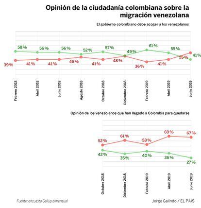 En Colombia, junio de 2019 ha sido el primer mes en el que una mayoría de ciudadanos ha respondido en la encuesta bimensual de la firma Gallup que su gobierno no debería acoger a quien venga de Venezuela. En paralelo, ha aumentado la visión negativa del local hacia el foráneo.