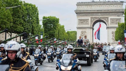 El desfile del 14 de Julio, la gran fiesta nacional francesa, el día en que se celebra la toma de la Bastilla, la jornada clásica de despliegue del orgullo y poderío militar francés, que ha inspirado a Donald Trump para organizar su propio desfile con tanques, ha tenido este domingo un inédito acento europeo. Por los Campos Elíseos han desfilado también más de un centenar de soldados españoles, junto con destacamentos de los otros países que forman parte de la Iniciativa Europea de Intervención (IEI), un proyecto de cooperación militar europea impulsado por Emmanuel Macron. Al lado del presidente francés, en la tribuna de honor, han asistido como invitados la canciller alemana, Angela Merkel, y otros mandatarios o altos representantes de los nueve países que participan en esta iniciativa, que en palabras de Macron supone: “Un bello símbolo de la Europa de la defensa que estamos construyendo”.