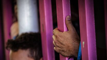 Dos familias venezolanas que estuvieron 23 días detenidas en Iztapalapa relatan a EL PAÍS que el encierro, los horarios restringidos y el maltrato los hicieron sentir que habían caído “en una cárcel”. Su delito: presentarse con sus pasaportes ante las autoridades mexicanas para pedir asilo. Como en Estados Unidos, las familias fueron separadas en el centro ya que los albergues tienen diferentes áreas para mujeres con niños, adolescentes y hombres. “Lloramos como nunca”, recuerda Carlos, uno de los migrantes que piden resguardar su identidad por seguridad. Durante un mes, vio a sus hijos unos minutos los lunes, miércoles y viernes. Aunque lo más impactante fueron las deficientes condiciones sanitarias. Había cuatro médicos en rotación para más de 400 personas. “La negligencia es altísima y te tratan mal”, dice Alejandra, una de las madres. Su bebé, un torbellino de ojos pequeños y pelo rizado, perdió tres kilos y padeció cinco días de fiebre sin recibir la asistencia y comida adecuada, asegura.