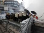 La ciudad ha quedado así dividida en dos frentes. Los enfrentamientos más enérgicos han tenido lugar en el lado oeste, donde agentes antidisturbios han recurrido a gases lacrimógenos para dispersar a la multitud, la cual se ha fragmentado en pequeños grupos que han continuado las reyertas en varias de las calles adyacentes. En Des Voeux Road Oeste las fuerzas de seguridad han reducido y detenido al menos a 15 jóvenes, mientras que en otras vías los encapuchados han levantado pequeñas empalizadas de papel y cartón a las que han prendido fuego para obstaculizar el avance policial.