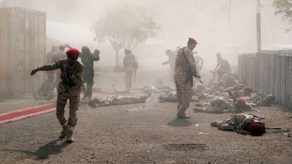 El ataque con un misil balístico y un dron ha golpeado un desfile en el que participaba medio millar de reclutas entrenados por miembros de la coalición que lidera Arabia Saudí contra los Huthi. “La explosión ocurrió detrás del escenario donde tenía lugar la ceremonia, en el campamento militar”, afirmó un testigo a la agencia Reuters. La base integra a fuerzas yemeníes apoyadas por Emiratos Árabes Unidos (EAU), aliado clave de Riad en la coalición y uno de los países de la región que entrena a las fuerzas de Hadi, aunque ha anunciado recientemente la reducción de tropas de Yemen.