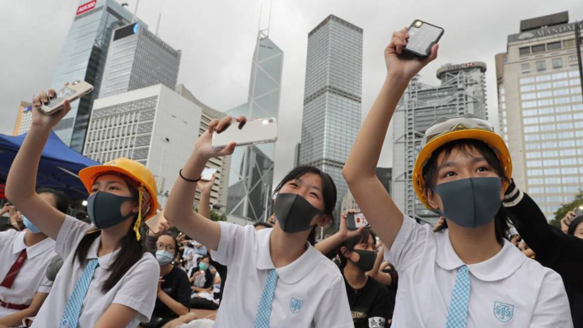 En el centro financiero de Hong Kong, hasta 4.000 jóvenes, según los organizadores, asisten a la concentración convocada por las asociaciones de estudiantes de enseñanza media. Muchos han observado la huelga y se han saltado las clases. Otros han venido en cuanto ha terminado el medio día. Algunos con el permiso de sus padres, otros a escondidas. Casi todos con la cara tapada con mascarillas o máscaras de gas. Las camisetas negras se mezclaban con los uniformes escolares; en la mayoría de los casos, una pegatina con lemas de protesta tapaban en las camisas los emblemas del colegio correspondiente.