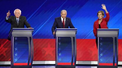 Fue uno de los instantes más descriptivos del tablero demócrata en estos momentos. Si hubiera que trazar un paralelismo con 2008, Biden encarna la primera candidatura de Hillary Clinton, la experiencia y el discurso pragmático frente al mensaje inspirador de aquel joven senador de Illinois que se convirtió en el primer presidente afroamericano de la historia estadounidense. Hoy, la ilusión obamista, la que habla de refundaciones, se encuentra repartida entre un grupo de precandidatos muy diverso. Nunca se habían presentado tantas mujeres (esta noche coincidieron en el escenario Warren, Harris y Amy Klobuchar), hay un aspirante de origen asiático, Andrew Yang, que propone una renta universal, toda una revolución en Estados Unidos, y otro de tan solo 37 años que es el primero abiertamente homosexual. A la cabeza, sin embargo, siguen dos veteranos de Washington, Sanders y Warren.