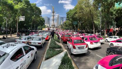 Delante del Ángel de la Independencia, en el centro de la avenida más importante de Ciudad de México, una decena de taxistas quema los tarjetones vehiculares con sus licencias profesionales. “Estamos aquí para ponerle fin a la anarquía que han impuesto las empresas internacionales”, exclamaba Ignacio Rodríguez Mejía, portavoz del Movimiento Nacional de Taxistas, que este lunes convocó una huelga nacional para pedir la inhabilitación de las aplicaciones de transporte privado como Uber y Cabify. “Solo pedimos que cumplan la ley o que se vayan y que dejen de atentar contra la economía de los mexicanos”, dijo y desató el aplauso de conductores de todo el país, que desde la madrugada de este lunes estacionaron sus coches a todo lo largo de los carriles centrales del Paseo de la Reforma.