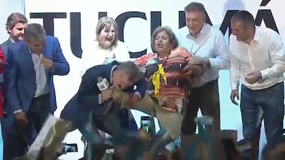 “Dame la pata”, le dice Mauricio Macri a una mujer a la que acaba de cantar el feliz cumpleaños. Luego se inclina y le besa el pie desnudo. “¡Cenicienta, encontré mi Cenicienta!”, le dice, eufórico, el presidente, mientras la mujer le arrebata el micrófono al grito de “Macri sos la patria, sos la patria”. “¡Sí, se puede!”, responde la multitud. Macri está en campaña por la reelección, y la noche del lunes celebró un mitin en Tucumán, una provincia gobernada por el peronismo. Tuvo allí su baño de masas, uno de los 30, a razón de uno por día, que su equipo programó hasta las elecciones del 27 de octubre. La escena del beso fue una muestra de tono que Macri ha dado a la campaña.