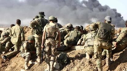 Otro de los puntos calientes fue la ciudad de Ras al Ain, que el Ministerio de Defensa de Turquía aseguró haber tomado este sábado. Fuerzas de ambos bandos consultadas por EL PAÍS matizaron que Turquía aún no se ha hecho con el control. “Estamos a las puertas de Ras el Ain y la tenemos prácticamente rodeada”, relató, en la tarde del sábado, el portavoz del ENS, el mayor Yusef Hamud, vía WhatsApp. “Nuestros efectivos siguen defendiendo la ciudad y al menos diez civiles han muerto en los bombardeos turcos”, dijeron oficiales de las FDS.