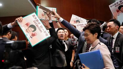 El discurso de la jefa del gobierno autónomo de Hong Kong, Carrie Lam, sobre el estado del territorio puso de manifiesto hasta qué punto se ha deteriorado el clima político en la antigua colonia británica tras cuatro meses de protestas. Por primera vez, Lam presentó sus propuestas de gobierno para el nuevo año político por vídeo previamente grabado. El intento de hacerlo por la vía tradicional, en el pleno del Legislativo en el primer día de sesiones del curso, acabó en sonoro fracaso cuando los diputados de la oposición le obligaron a callar entre fuertes abucheos y gritos con el lema de los manifestantes: “¡Cinco demandas, ni una menos!”
