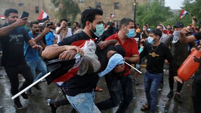 Tahira se cubre los ojos llorosos con la bandera de Irak que cuelga de sus hombros, mientras unos chavales le ofrecen botellines de agua con los que aclararse la cara. Acaba de ser alcanzada por los gases lacrimógenos que la policía ha lanzado contra los manifestantes en la plaza de Tahrir (Liberación) de Bagdad este viernes. Al menos dos de ellos han muerto por el impacto de los proyectiles de gas, pero ella se niega a retroceder. “No tengo miedo”, asegura esta profesora universitaria de 55 años y madre de dos hijos, que ha venido a la protesta “para apoyar a los jóvenes iraquíes”.