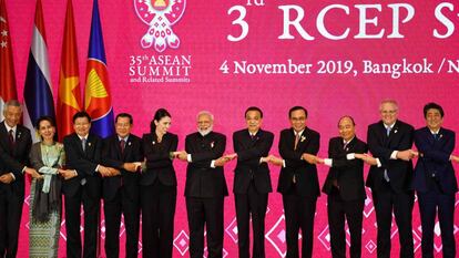 Quince países de Asia han concluido este lunes en Bangkok las negociaciones para constituir lo que promete ser la mayor zona de libre comercio del mundo y que se ratificará el año próximo. La RCEP, la Asociación Económica Integral Regional, es un proyecto promovido principalmente por Pekín, que se negociaba desde 2012 y que no incluye a Estados Unidos. En las negociaciones en la capital asiática, la India ha decidido no sumarse finalmente tampoco a la alianza por razones de “interés nacional”.