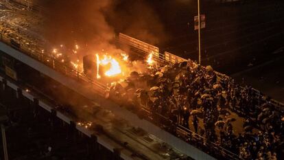 El plan de las autoridades de Hong Kong de reabrir el túnel más importante de la ciudad derivó este domingo en uno de los choques más graves de los cinco meses de protesta en la ciudad. Tras una batalla campal entre los estudiantes atrincherados en la Universidad Politécnica y la policía, que advirtió de que usaría munición real si los primeros no dejaban de lanzar cócteles molotov y otros objetos, los cuerpos de seguridad bloquearon los accesos al campus. Ya en la madrugada de este lunes, los manifestantes prendieron fuego a la entrada principal para cortarles el paso. Alrededor de 60 personas fueron arrestadas en el Museo de Ciencia, cerca del campus universitario, según informó la emisora RTHK.