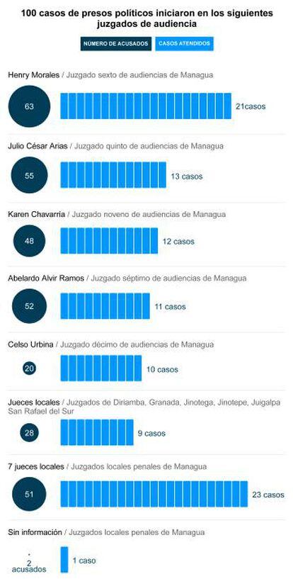 Cuatro días después de su detención fue presentado ante el juez Henry Morales. Este juez, de acuerdo con una revisión de 100 actas de audiencias preliminares e iniciales, fue el que más casos de presos políticos atendió durante el año pasado: 21 de 100. Es decir, casi la misma cantidad de audiencias que atendieron en conjunto siete juzgados locales penales de Managua.