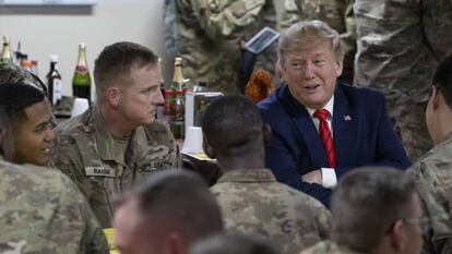 Donald Trump visitó por sorpresa este jueves, Día de Acción de Gracias, a las tropas estadounidenses desplegadas en Afganistán y anunció la reactivación de las conversaciones de paz con los talibanes, rotas el pasado septiembre. En su primer viaje a este país —el segundo a una zona de guerra, tras Irak en la Navidad de 2018—, el presidente de Estados Unidos señaló que la milicia “quiere un acuerdo” y que se reunirían con ellos para buscar el fin de un conflicto que ya ha cumplido 18 años y que se ha convertido en una tela de araña para Washington.