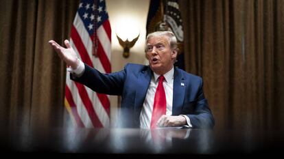 El presidente Trump abre un nuevo frente en medio de la crisis del coronavirus: el Congreso. En su rueda de prensa de este miércoles, ha amenazado con suspender las dos Cámaras del Capitolio para poder forzar el nombramiento de cargos a los que los demócratas se oponen, eludiendo la preceptiva aprobación del Senado. Trump acusa al Congreso de “obstruir” su competencia de nombrar jueces y otros cargos al continuar celebrando sus sesiones pro forma, esto es, reuniones de trámite muy breves y durante las que no se suelen adoptar medidas. ”Si no podemos actuar para nombrar a esa gente que necesitamos, y que necesitamos especialmente por la pandemia, voy a hacer algo que preferiría no hacer”, ha advertido.
