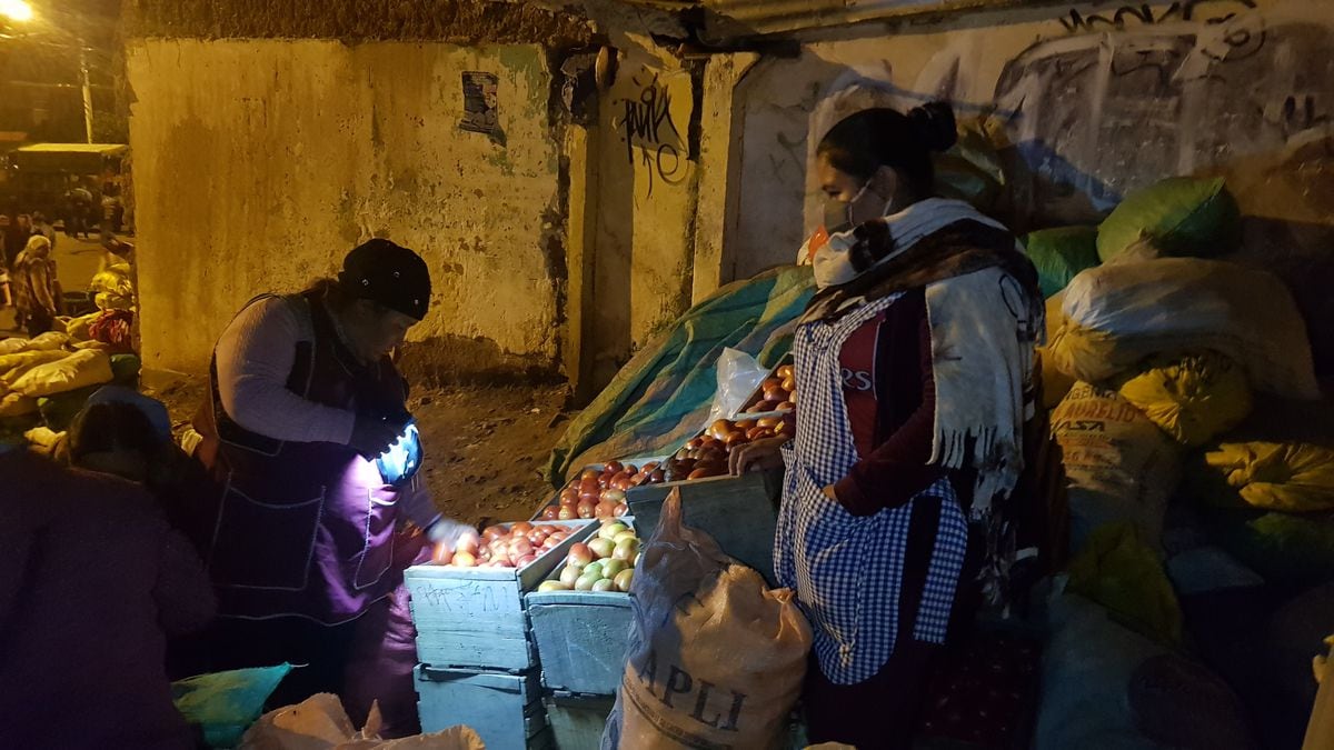 A medida que pasan las horas, más productores empiezan a llegar desde Oruro o del lado de Santa Cruz, del occidente y oriente del país, respectivamente. Los camiones comienzan a descargar los productos que traen y los agricultores empiezan a acomodarse a lo largo de la recta donde se emplaza este mercado campesino. Aun así, hay espacios vacíos y el viento helado produce un silbido en medio de la noche.