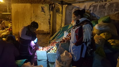 El punto de venta más importante de productores agrícolas de esta región, que suele aglutinar a un millar de personas en cualquier otra noche previa a la pandemia —entre campesinos que llegan a ofrecer sus productos e intermediarios que compran vegetales al por mayor—, apenas tiene una decena de personas en los alrededores. Cientos de bolsas de diferentes colores que contienen zanahoria, achojcha, judía verde, entre otras verduras, permanecen apiladas en el piso de tierra. La temperatura es de 10 grados. Las mujeres se resguardan del frío cerca de los bultos, aguardando que la noche mejore y pueda traer compradores para su producción. Es la situación de muchos productores agrícolas en la nación andina, que en medio de la crisis sanitaria que enfrenta, continúan trabajando para proveer alimento a las ciudades a pesar de los problemas logísticos y el riesgo de contagio del coronavirus.