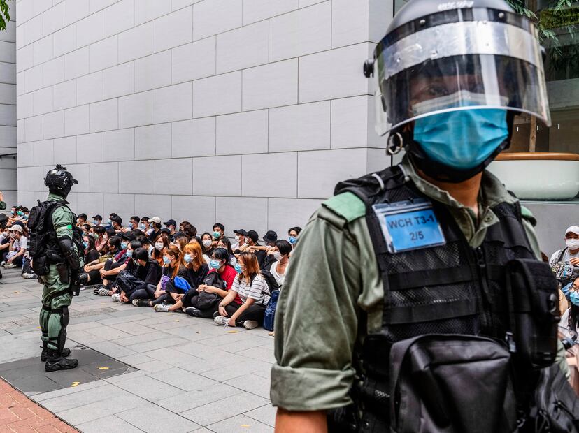 En el distrito financiero de Central, la policía antidisturbios lanzó balines de pimienta para dispersar a la multitud. En el resto de la ciudad, agentes que patrullaban en equipos de diez arrestaban a grupos de presuntos manifestantes, a los que mantuvieron sentados en el suelo antes de registrarles. Más de 300 personas quedaron detenidas, la mayoría como sospechosas de reunión ilegal.
