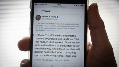 “Este tuit incumplió las reglas de Twitter relativas a glorificar la violencia. Sin embargo, Twitter ha determinado que puede ser de interés público que dicho tuit permanezca accesible”, explicaba la red social, en un mensaje que ocultaba el tuit de Trump, al que se podía acceder pinchando en un enlace. El texto del presidente de Estados Unidos describe como “matones” a los manifestantes que durante los últimos tres días han salido a las calles de Minneapolis, la capital del Estado de Minnesota, para protestar por la muerte del ciudadano afroamericano George Floyd durante una detención policial, mientras pedía auxilio porque se quedaba sin aire, como se escucha en un vídeo que documenta los hechos.