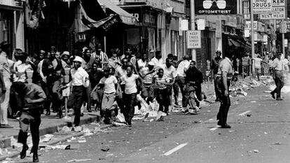 3. Rebelión de Watts 1965. Aquel verano se vivieron los primeros grandes disturbios más allá de los derechos civiles, en los que se mezclaba la violencia sistémica contra los negros y la discriminación estructural. Comenzó también con una detención. El 11 de agosto, sobre las siete de la tarde, una patrulla de policía detuvo a dos hermanastros en un coche en Watts, un barrio deprimido y de población predominantemente negra en el sur de Los Ángeles. Uno de ellos se resistió y un policía le golpeó con la porra. La gente empezó a acudir al lugar, entre ellos su madre, que también fue arrestada. Llegó otra patrulla, se juntó más gente y siguió subiendo la tensión. Antes de una hora, se habían iniciado unos disturbios que se conocerían como la rebelión de Watts. El gobernador desplegó 14.000 soldados de la Guardia Nacional. La violencia y los saqueos duraron seis días. Alrededor de 1.000 edificios fueron destruidos. Murieron 34 personas y 4.000 fueron detenidas. Durante casi tres décadas, fue la revuelta racial más violenta del siglo XX.