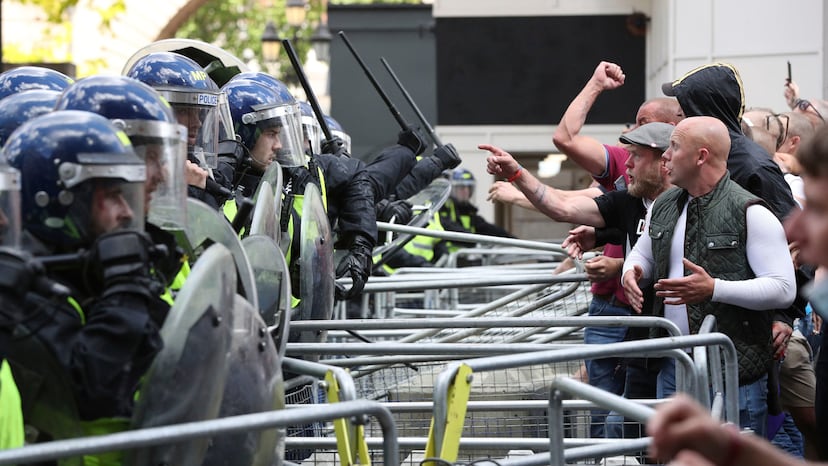 Cientos de miembros de organizaciones de ultraderecha británicas, como Britain First, se han enfrentado este sábado en Londres a las fuerzas de seguridad en los alrededores del Parlamento y en la Plaza de Trafalgar. A pesar de que el movimiento Black Lives Matter UK desconvocó unas horas antes la manifestación prevista para evitar escenas de violencia, grupos radicales “antifascistas” y hooligans c...
