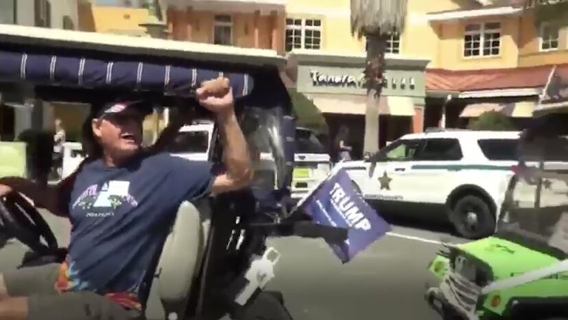 El vídeo, a continuación, muestra a un grupo de jubilados en un carrito de golf marchando delante de una contraprotesta contra el presidente. Nada más comenzar el vídeo, un hombre al volante de uno de estos carritos proclama “¡poder blanco!” con el puño en alto.