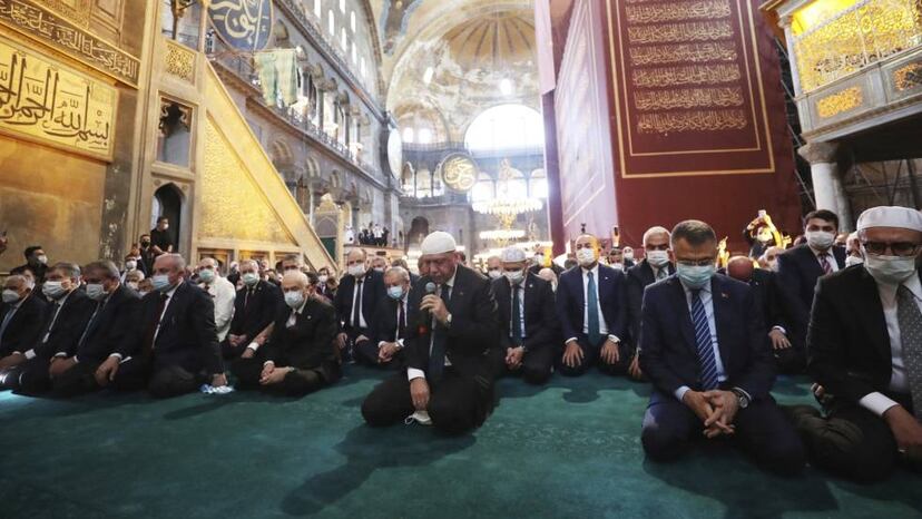 La ceremonia fue dirigida por el presidente de la Dirección de Asuntos Religiosos, Ali Erbas, que calificó la reapertura de Santa Sofía al culto musulmán como un momento de “resurrección” del islam. El presidente Erdogan, en primera fila y acompañado por líderes políticos turcos, recitó versículos del Corán, lo que hizo estallar de júbilo a los asistentes, que seguían lo que ocurría en el interior del templo a través de pantallas gigantes colocadas en el exterior.