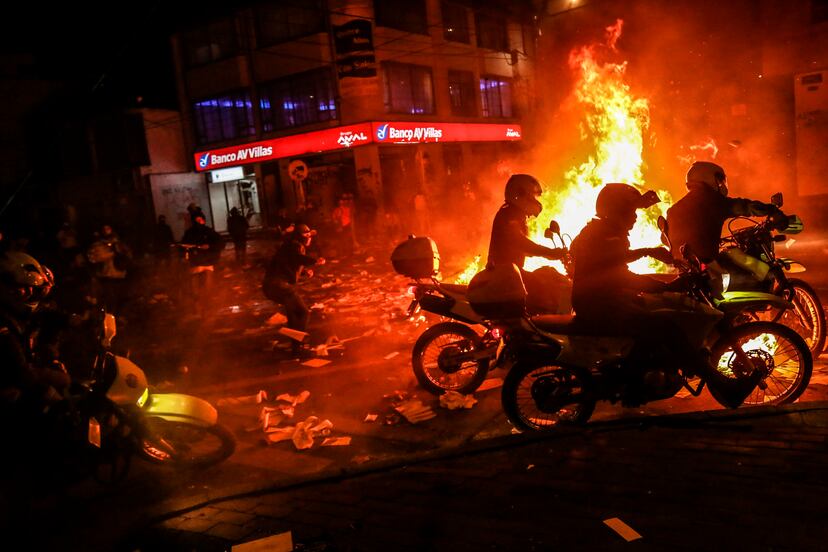 Durante más de ocho horas, la capital colombiana vivió un escalamiento de disturbios que empezaron con pedreas e incendios a los Comandos de Acción Inmediata de la Policía (CAI), siguió con una batalla con gases lacrimógenos y destrozos al transporte público, tanquetas del Escuadrón Antidisturbios que repelían a los manifestantes y disparos que acabaron con la vida de varios jóvenes. Los vídeos que circulaban por las redes sociales en la larga noche de miércoles avizoraban que habría muertos y estos se fueron confirmando en la madrugada en los hospitales de la ciudad.