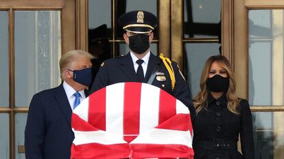 Los Trump han acudido por la mañana, con sendas mascarillas, y han permanecido unos minutos de pie en silencio ante el féretro de la juez, cubierto por una bandera estadounidense. Después han regresado a la caravana presidencial en dirección a la Casa Blanca. “¡Honra su deseo!”, se ha oído también gritar a los congregados ante el Supremo, en referencia a la voluntad supuestamente expresada por Ginsburg a su hijo, en su lecho de muerte, de que su vacante fuera ocupada por la persona a la que designe el presidente que salga de las elecciones del 3 de noviembre.