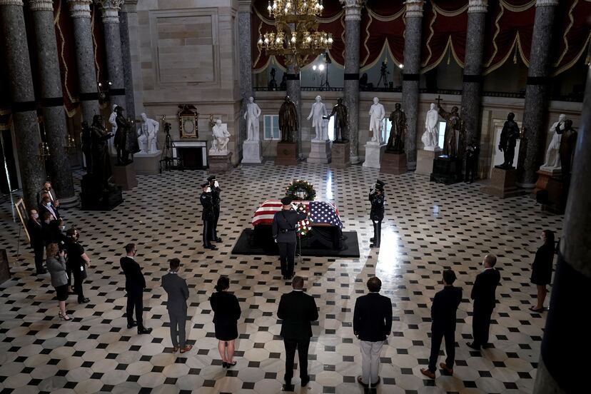 La presidenta de la Cámara de Representantes, la demócrata Nancy Pelosi, dio la bienvenida a los familiares y resto de asistentes, un número reducido debido a las restricciones impuestas por el coronavirus, entre los que figuraban el candidato presidencial Joe Biden con su esposa, Jill; la candidata a la vicepresidencia, Kamala Harris, con su marido, Douglas, y el líder de los demócratas en el Senado, Chuck Schumer. Llamaba la atención, sin embargo, la ausencia de algunos pesos pesados del Partido Republicano en el Congreso, como el líder de la mayoría en el Senado, Mitch McConnell. Fue una muestra del clima de confrontación que vive la capital estadounidense, una más después de los abucheos que el presidente, Donald Trump, recibió el día anterior cuando acudió a la capilla ardiente del Supremo.