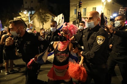 La presunta tentativa de Netanyahu para suspender las manifestaciones mediante el endurecimiento del confinamiento se ha estrellado contra una mayoría de bloqueo. “Democracia para todos”, rezaba en hebreo y árabe la pancarta en torno a la que Avi Cohen, de 45 años, y sus acompañantes hacían sonar tambores y trompetillas el sábado cerca de la calle de Balfour, la sede de la residencia del primer ministro blindada por un triple cordón policial. Entre los manifestantes, varios agentes circulaban provistos de tabletas digitales para multar a quienes no portaran mascarilla. “No nos iremos de aquí hasta que él se vaya”, argumentaba. Todos coreaban “Bibi go home!” a ritmo de festival de música electrónica.