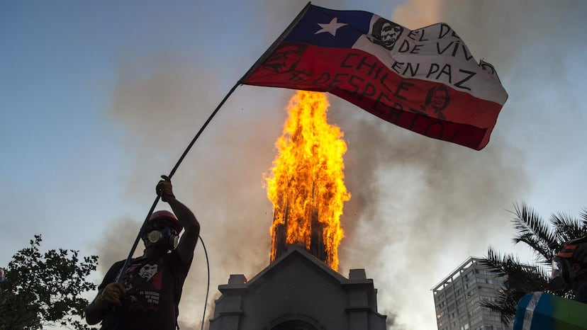 Dos iglesias han sido quemadas en Santiago de Chile, al conmemorarse un año del estallido social del 18 de octubre de 2019, y a una semana del proceso electoral más importante de las últimas tres décadas: el plebiscito del 25 de octubre próximo, que definirá la suerte de la Constitución vigente, de 1980. Durante la jornada, al menos 25.000 personas regresaron este domingo a la Plaza Italia, la zona cero de la capital, de acuerdo a las cifras oficiales de Carabineros. Aunque hubo incidentes aislados, como el enfrentamiento entre dos barras bravas de fútbol y el ataque a un edificio de una corporación dedicada a prevenir accidentes laborales –la Mutual de Seguridad–, fue durante la tarde cuando comenzaron los sucesos de mayor gravedad.