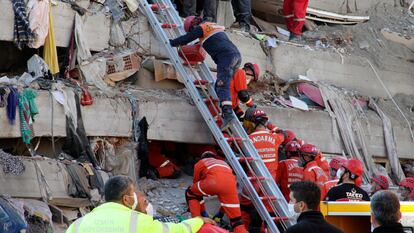 Los Apartamentos Doganlar se construyeron en la década de los ochenta, cuando esta zona de Esmirna, anteriormente de huertos, se abrió al desarrollo urbanístico. “Es un suelo arenoso, con aguas por debajo”, señaló Sükrü Ersoy, geólogo de la Universidad Técnica de Yildiz, en declaraciones a la cadena CNN-Türk. También hay problemas con el hormigón armado utilizado: cemento de mala calidad y armaduras de acero sin corrugar (las varillas de acero corrugado solo se empezaron a utilizar de forma más extendida tras el terremoto que en 1999 causó más de 17.000 muertos en el noroeste de Turquía). “Los compañeros se han sorprendido mucho: hay columnas que incluso golpeándolas con un martillo se convierten en polvo”, ha denunciado Basaran Aksu, portavoz de un sindicato de mineros que ha enviado a sus miembros a Esmirna para ayudar en las tareas de desescombro.